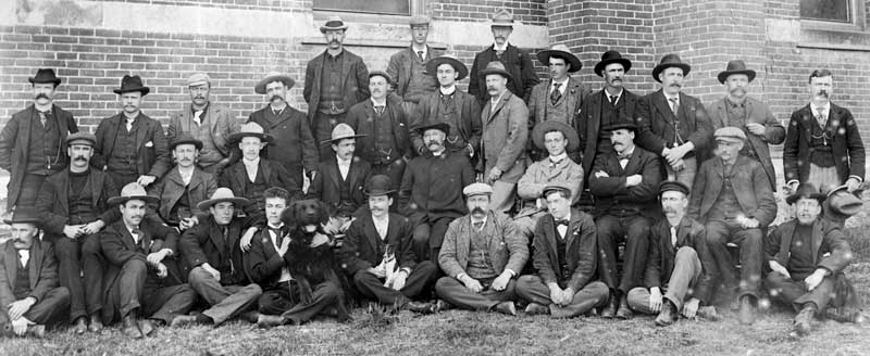 Members of the “Yukon Party from Manitoba” at Victoria, BC. Front row (left-right): N. McNabb, J. H. “Jack” Baker, H. Young, T. McKay, Archibald J. Bannerman, Charles Garbutt, M. H. Jones, L. R. MacKenzie, Chris Corneil. Second row: H. Cameron, Dr. Horace C. Norquay, Alexander I. MacFarlane, William Campbell, Archdeacon George McKay, Herbert A. Tremayne, George McLeod, S. C. Lipsett. Third row: John Bean, C. W. “Bill” Moore, W. Woodman, E. Wall, Samuel Taylor, John D. “Jim” McMurray, Lewis O. Patterson, P. W. McKenzie, Edward Wass, Daniel H. Coates, Thomas Nixon, Stephen Jones (Dominion Hotel). Back row: J. Braithwaite, E. Price, C. G. I. Currie.