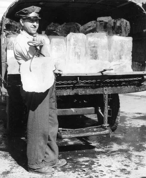 The Iceman Cometh. Mike Chiponski of the Portage Ice Company was well known to local youngsters who crowded around his truck during deliveries to pick up ice slivers to suck on during hot summer days. Portage Daily Graphic, 18 August 1952.