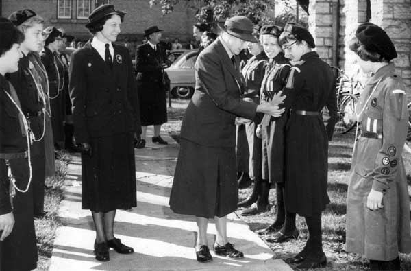 Lady Baden-Powell, wife of Scout Movement founder Robert Baden-Powell, inspects the uniforms of Girl Guides from Portage la Prairie who greeted her visit to the St. Mary’s Parish Hall. Portage Daily Graphic, 18 September 1955.
