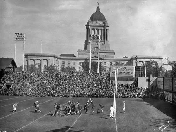 Moose Graham and His Educated Toe. A football game is played in the old Osborne Stadium west of the Manitoba Legislative Building, Winnipeg, 1949.