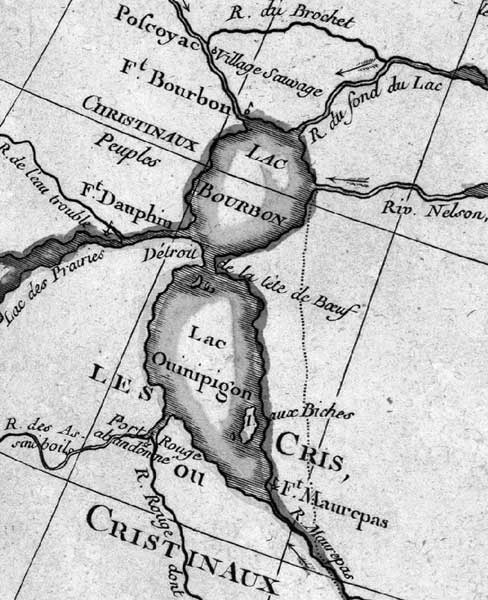 Lake Winnipeg (“Lac Ouinipigon” and “Lac Bourbon”) in Rigobert Bonne’s 1783 L’Amerique Septentrionale, from the US Library of Congress web site.