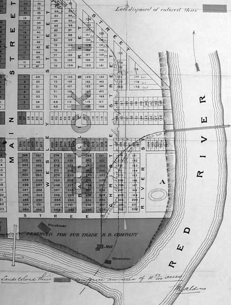 The Forks, from a map of the Hudson’s Bay Company Reserve showing the proposed route of the Northern Pacific and Manitoba Railway, January 1887.