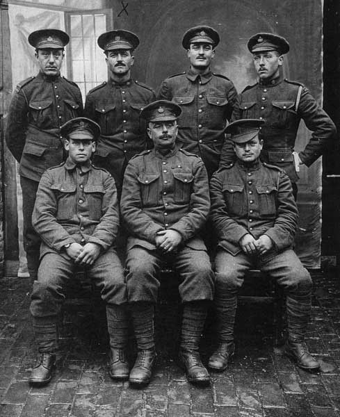 Men of #2 Company, Princess Patricia’s Canadian Light Infantry, November 1915 at Place Vogel, Flixecourt, Picardy, France. Photographer: E. Daussey. Front (L-R): Harold E. Agar #748, William B. Crumb #568, Fred A. Pritchett #771. Back: Charles Little #772, William G. Johnston #552, Robert Western #772, Sydney Hawkbridge #522.