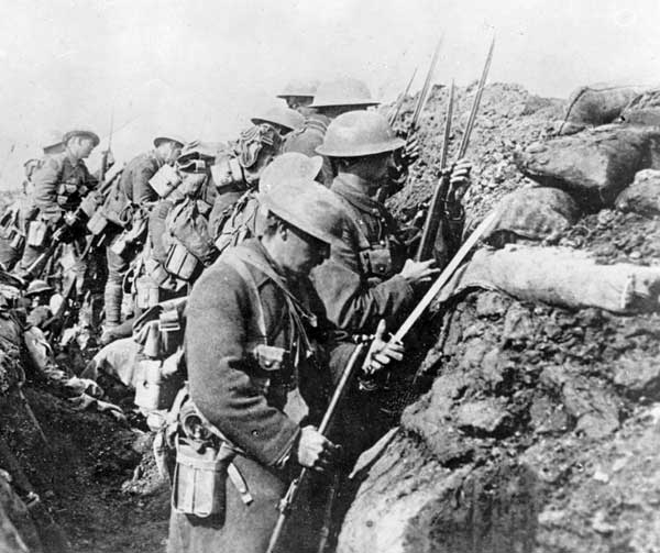 Trench-bound Canadian soldiers fasten bayonets to their rifles in preparation for a charge, France, September 1916.