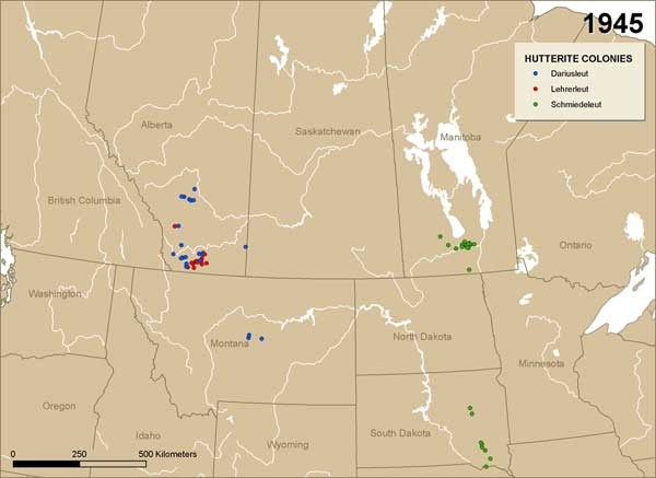 Map 2. Hutterite colonies in North America by leut, 1945.