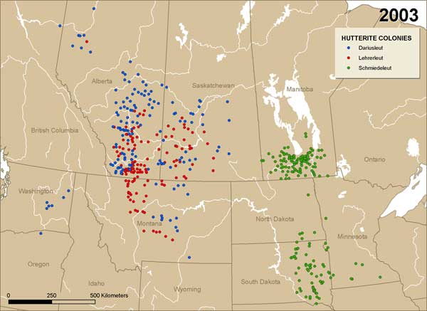 Map 3. Hutterite colonies in North America by leut, 2003.