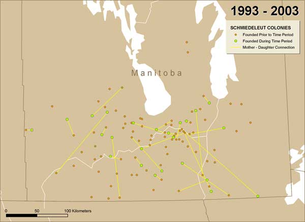 Map 4. Schmiedeleut colony diffusion in Manitoba, 1993-2003.