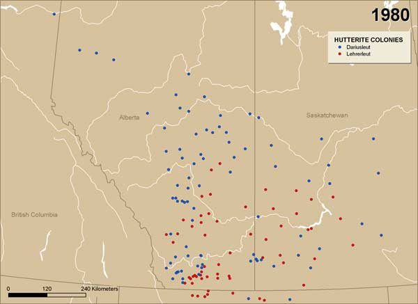 The reasons for the present pattern of Hutterite colonies in North America are many and complex. The initial migration to Canada was a response to persecution but colony expansion was a response to various discriminatory laws, such as the Alberta Communal Property Act, that intended to disperse Hutterites and prevent them from being a significant presence in any one area. In Manitoba similar restrictions were placed on the Hutterites under a socalled “gentlemen’s agreement,” that lasted until 1972 when the provincial government declared it to be unenforceable. Alberta’s Communal Property act was repealed in 1973. A comparison of Maps 5 and 6 reveals the effects of these restrictions on the locations of new colonies. Dariusleut and Lehrerleut colonies that were unable to obtain land near existing colonies moved into the Peace River District and across the provincial boundary into Saskatchewan.