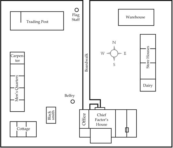 The fort enclosure, which faced the north, stood back only thirty-five yards from the brow of the bank. A stockade of logs set upright took in an area which measured three hundred feet from east to west, and two hundred and seventy-five feet from north to south. As one entered the gate, the trading store and district offices was on his right. Further in, a long building divided into compartments the first of which was the carpenter’s shop, and the other served as quarters for the men. Still further in were the blacksmith shop, the out-of-door bake oven and a cottage for a married member of the staff. At the back of the enclosure; facing the gate, was the Chief Factor’s house, one room of which was used as his office, and another large room served as a reception room for Indians. The big house, as it was called, was approached by a four foot plank walk from the gate.