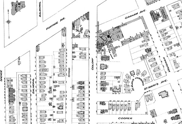 The neighbourhood. In 1897, the Allman family moved into a comfortable home at 270 Colony, south of Portage Avenue, among a row of houses on the west side of the street (in the lower, centre of this 1906 map). Wesley College (now the University of Winnipeg) was a short walk to the northwest, and the Blackwood Brothers’ beverage works was just up the street, on the east side.