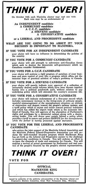 Booth and the Manitoba Liberal and Progressive Election Committee advertised in The Jewish Post, Dos Yiddishe Vort, The North-Ender, The Winnipeg Evening Tribune, and the Winnipeg Free Press. Keenly aware of the anxiety of Winnipeg Jews, Booth’s advertising included a statement made by King saying that “We Don’t Want Any Hitlerism or Fascism in Canada”. Booth claimed that the Liberal Party had “performed a leading part in the building up of British institutions and traditions”, including political and religious freedom, free speech, and the equal franchise, whereas the “growth and encouragement” of a multiplicity of political parties had led to dictatorship in continental Europe. His message was clear: in Canada, “new and factional parties should not be encouraged” and governmental problems could be solved by voting for “an established party with traditions to maintain”. [43]