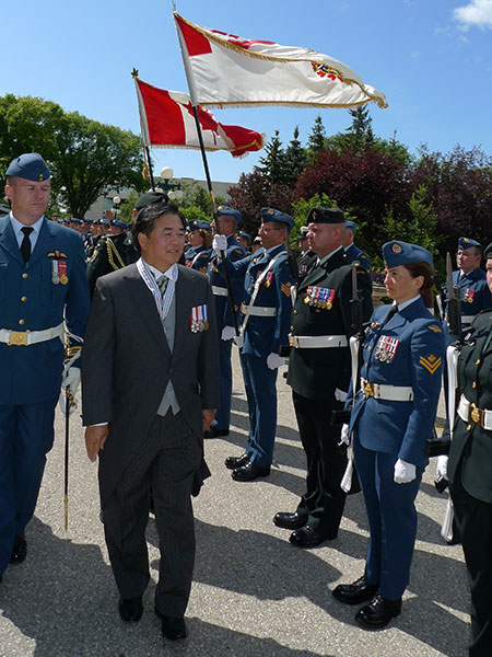 Philip Lee reviews military personnel attending his installation as Lieutenant-Governor at the Legislature on 4 August 2009.