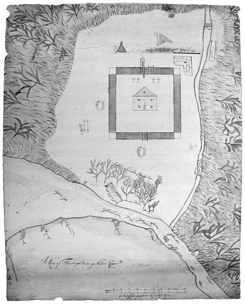A log tent was built in the autumn of 1749 on “a very Convenient Spot near a Creek opposite to Flambro’ head,” about twenty miles west of York. [8] The following spring, Hughes and Ford began building a “Factory house” of about thirty feet square that was ready for occupation by the end of the summer. Early in 1751, Hughes recorded that the “Distance from the House Door to the Fore Gate is 22 ft: The same from the House to the Stockade on the Back Part. From Corner to Corner of the Stockades is 73 ft: 4 Inchs.” [9] Ford was a good carpenter [10] but, given the apparent sense of urgency, he may have concentrated on building the house quickly rather than on building it well. In 1751, Samuel Skrimshire gave his candid opinion of the house: “I must make bold to say, it is at present worse then any Log tent I ever livd, in for smoke & rain.” He requested that a carpenter, two sawyers, and a bricklayer be sent from York as soon as possible. [11] Construction continued intermittently over the next several years, and included some fortification. Four cannon were sent out in 1751, and in 1753 Skrimshire spoke of building bastions, though he was worried about a sufficient supply of large timbers. [12]