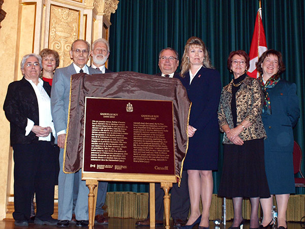 The Roy plaque unveiling ceremony was held at the Fort Garry Hotel on 12 November 2009, preceding La Maison Gabrielle-Roy’s annual gala. Attending were (L-R): Mme. Jacqueline Blay (President, La Maison Gabrielle-Roy), Mme. Annette Saint-Pierre, M. L. Landry (cousin of Gabrielle Roy), Dr. Robert O’Kell (Manitoba member, Historic Sites and Monuments Board of Canada), Mr. Grant Nordman (Councillor for St. Charles, City of Winnipeg), Ms Shelly Glover (MP for Saint-Boniface), Dr. Carol Harvey (Professor Emerita of French, University of Winnipeg), and Ms Julie Dompierre (Executive Secretary, Historic Sites and Monuments Board of Canada).