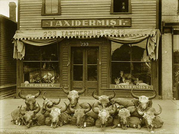 The last buffaloes. The skulls of eleven bison, marked for identification during auction, were displayed in front of Edward Darbey’s taxidermy shop on Main Street in November 1911.