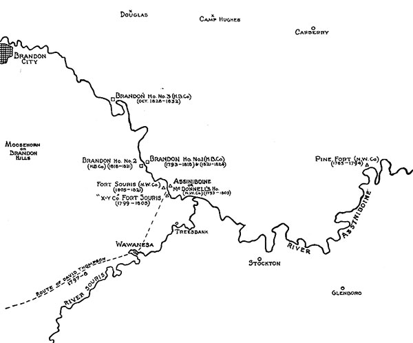 Map showing the Souris River forts and the route taken by David Thompson to the Mandan Country in 1797-8.