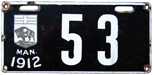 In November of 2007, my wife and I walked into an antique shop on Corydon Avenue in Winnipeg with no intensions of buying anything. We had just sold our home and were downsizing, getting ready for retirement. Had you told me I would later walk out with an antique Manitoba license plate from 1912, I would have said you were crazy. (The fact that I paid $100 for it is also … well, never mind.) I am not sure what attracted me to it, but when I saw it, I knew that I had to have it. It is a little smaller than today’s license and being made of iron and coated with porcelain, a lot heavier. It has a black background with white lettering and numbering. It also sports a white buffalo. It is #53.