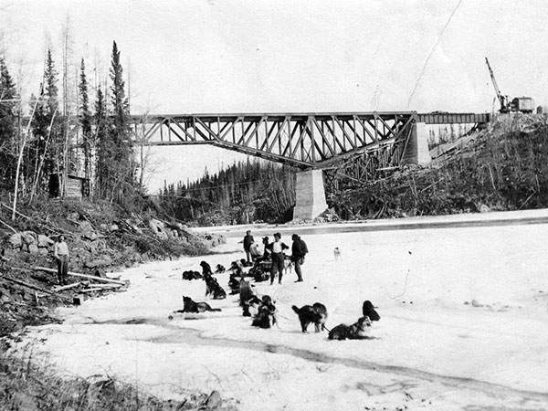 Aboriginal people and their dog teams arrive at the northern community of Manitou Rapids near the newly constructed Hudson Bay Railway bridge over the Nelson River, April 1916.