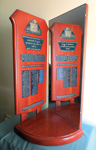 The Winnipeg Press Club chapel board was a gift from retired Los Angeles Examiner editor Jim Richardson in 1958. He was the keynote speaker for the Press Club’s 70th anniversary dinner. It stands 32 inches high, with a mirror on one side to reflect the backwards and reverse type familiar to newspaper people who worked in the days of lead type.