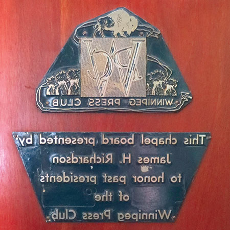 Printed backwards and reversed, the Winnipeg Press Club logo, with the inscription below reading “This chapel board presented by James H. Richardson to honor past presidents of the Winnipeg Press Club.”