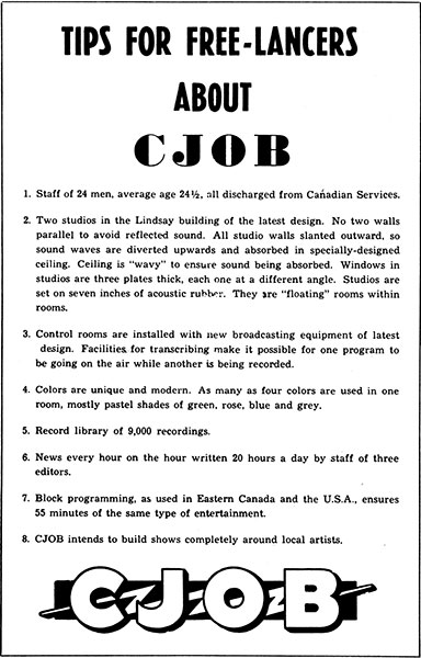 A 1946 ad by CJOB Radio in the Press Club’s Beer & Skits Program described its broadcast facilities in the Lindsay Building in downtown Winnipeg.