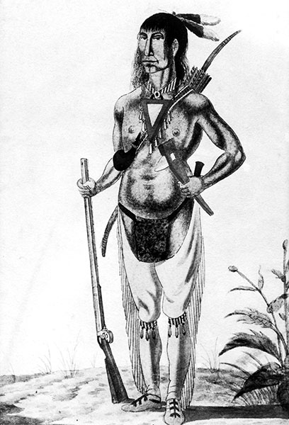 “Indian Chief.” A watercolour painting of a Saulteaux man in traditional dress, by early Red River painter Peter Rindisbacher (1806–1834), is thought to be of Peguis.