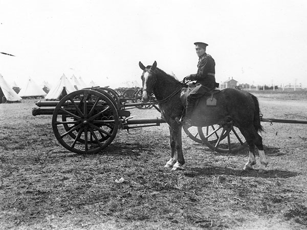A gunner with 18-pound cannons at Camp Sewell, around 1912.