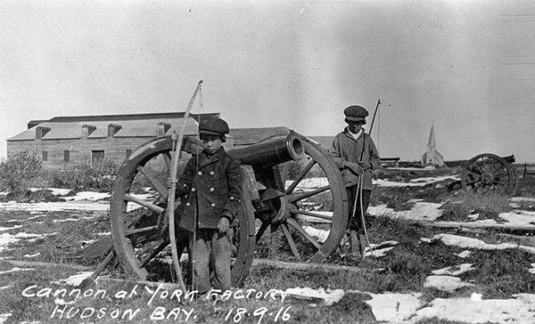 An unfair fight? Boys posed with bows and arrows beside cannons at York Factory, 1916.