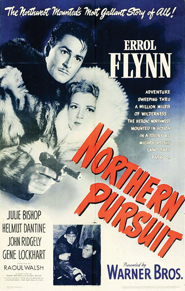 “Breathless adventure.” An advertising poster for the 1943 Hollywood movie Northern Pursuit, set in a fictionalized Manitoba, featured heartthrob Errol Flynn in the role of a Mountie of German ancestry who served in the mythical RCMP detachment at Bear Lake. Flynn succeeded in thwarting a Nazi sabotage plot.