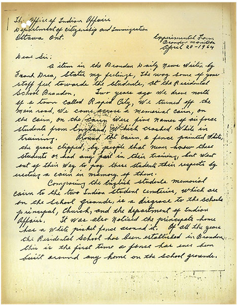 A 1964 letter written by Alfred Kirkness to the Office of Indian Affairs at Ottawa sought action for the residential school cemeteries at Brandon.