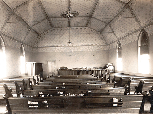 Following union of the Methodist and Presbyterian congregations at Boissevain in 1925, services were held in the Methodist building and the St. Andrew’s Presbyterian building, built in 1886–1887 and seen in this postcard view around 1908, was bought by those who wished to remain Presbyterian. It remains in use as a church today.