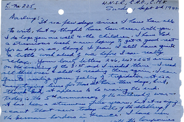 The stress felt by many women in having to manage their families without their spouses during the war is also evident in the Wilmots’ correspondence. In her letters to Laurence, Hope frequently expressed the loneliness and strain that she was under, caring for the children on her own and also dealing with her aging parents. This was compounded in August 1944, when her mother suffered a debilitating stroke. In addition to worrying about her mother’s prognosis, Hope was also afraid that she would be expected to care for her. She writes,