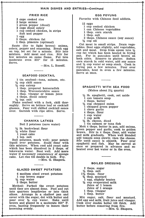 The recipes in the fifteen pages that follow are gathered under the following headings: “Party Luncheons”; “Main Dishes and Entrees”; “Rolls, Buns, Quick Bread”; “Cakes”; “Tortes, Cookies”; “Canning, Pickling.” The first and largest category, “Party Luncheons,” lists menus for “luncheons,” “evening parties” and “cocktail parties”. “Party Luncheon No. 1” includes the following items: “Fruit Juice; Canapes; Gefilte Fish with Mushroom Sauce; Cheese Lockshin Kugel; String Beans and Corn Niblets; Shoe String Potatoes; Pickles, Relishes, Olives; Rolls; Pineapple Whip Dessert; Coffee; Cookies.” [16] “Cocktail Party No. 1” offers this sage advice: “For a cocktail party a hostess really can let herself go but here, too, proper planning saves a lot of last-minute rush.... A good supply of (knishes) saves the hostess many hours of making fussy hors d’ouvres (sic).” [17]
