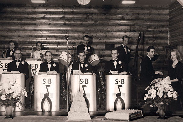 That raising included a lot of music. Bob’s parents, Wes and Ruby, were both musical people, actively involved in the arts in Raymond, participating in plays and musicals in the opera house, playing in dance bands and participating in choirs and cultural events at church. Naturally, Bob was inclined to participate in music as well. Though he had one year of formal piano lessons, Bob received most of his musical education through hands-on performance. His older brother Nolan, five years older, was possibly his most influential music teacher. Nolan formed a dance band, and he quickly drafted his younger brother to play percussion in the group, starting when Bob was eleven. Nolan’s band played at dances all around southern Alberta. Hanging out and rehearsing with the older teen musicians in the band, Bob also picked up the clarinet, saxophone and trumpet.