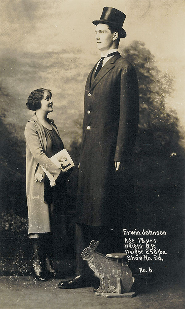 For the past 20 years, I have been exploring Manitoba’s history primarily through my hobby of collecting antique postcards. Almost ten years ago, I saw an image of a postcard that pictured a young man named Erwin Johnson, towering above a young woman. The caption said he was 18 years old and eight feet tall. A note that accompanied the card said that he was from Manitoba. I was intrigued and, wanting to acquire a card of my own, searched for years. Earlier this year, I finally found one. Once it was in my hands, I was driven to learn more about Erwin. My online searches initially produced only scattered bits of information and articles—none that painted a very full picture. As I researched further, and learned more about him, I became even more fascinated with him and the course of his life’s journey. Convinced that others would also be captivated with his story, I wrote this short biographical sketch of a unique Manitoban.