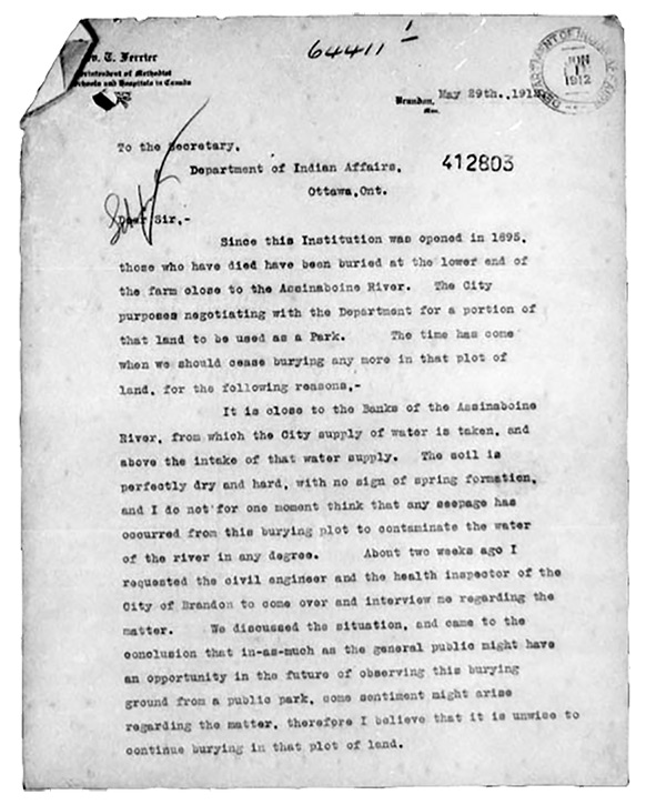 On 29 May 1912, Rev. Thompson Ferrier, Principal of the Brandon Residential School, wrote to the Secretary of the Department of Indian Affairs at Ottawa to propose the establishment of a new cemetery for children who died at the school. It would replace the previous burial ground beside the Assiniboine River that the City of Brandon was proposing to develop as a park. Ferrier noted that