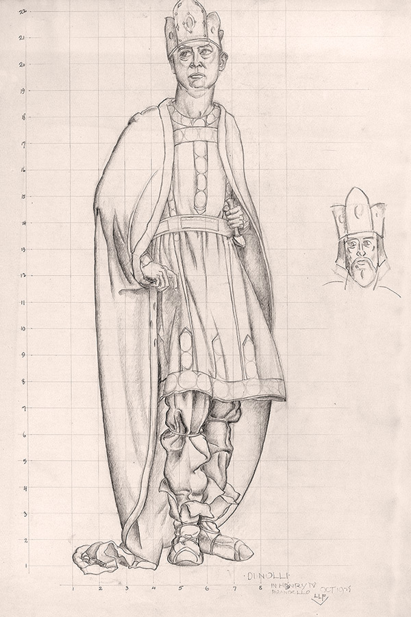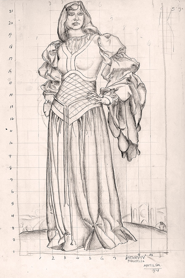 A photograph shows the cast of Henry IV in their costumes and medieval setting designed by FitzGerald. Seated foreground right is Robert Ayre in his role as The Old Servant. Flanking the throne centre stage are two large framed pictures. Although these are barely visible, they may be identified as FitzGerald’s paintings of the characters Donna Matilda Spina (left) and Henry IV (right). The painting of Donna Matilda Spina (now titled Lady in Green in the collection of the Musée d’art de Joliette) was worked up from a preparatory drawing (inscribed ‘Matilda’ lower right) squared for transfer. This drawing would have been consulted by members of the Costume Committee responsible for making the outfit.[17] Likewise a squared-for transfer preparatory drawing was made as the study for the large pendant painting of Henry IV (location unknown). The figure in the drawing conforms in every detail to the pose and costume of the King in the painting—seen best in the background of a publicity still. Although FitzGerald marked the drawing ‘Dinolli’ suggesting it was for the costume of the character the Marquis Charles di Nolli, it is evident that the design was to serve for both di Nolli and Henry IV, whose disembodied, bearded and crowned head was sketched by FitzGerald at the right of the sheet.