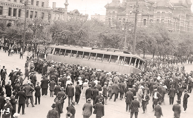 An iconic photograph of dissent, of a crowd overturning a streetcar on 21 June 1919,
