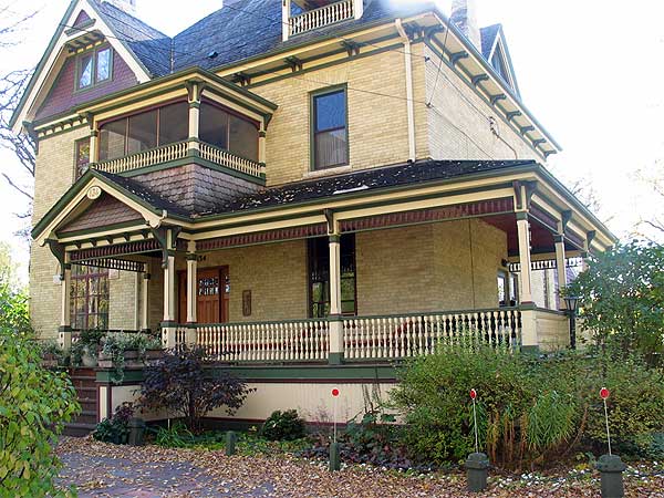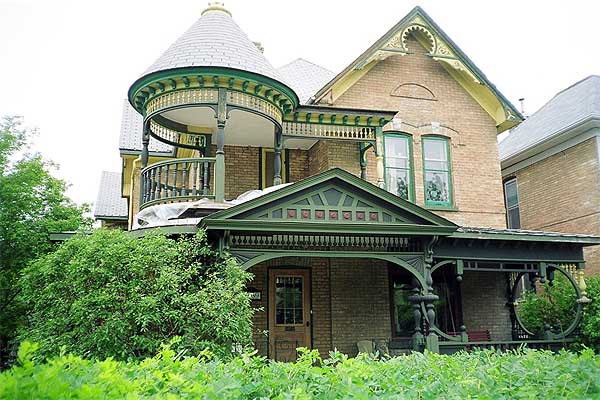 This splendid 1895 house exudes extreme Queen Anne style dripping with Eastlake decoration. The great opportunity of Eastlake style is unlimited decorative potential. The shaping of wood using basic hand tool technology – chisel, gouge and lathe – becomes fine art in the able hands of an imaginative artisan. The design invention and craft displayed on this house is a consummate delight to the senses. The first floor porch and the round balcony above dominate your attention. The upper balcony’s conical roof topped with the orbs and finial gives the roofline a fantasy feeling abetted by the rich colours and whimsical bargeboard designs on the gable ends.