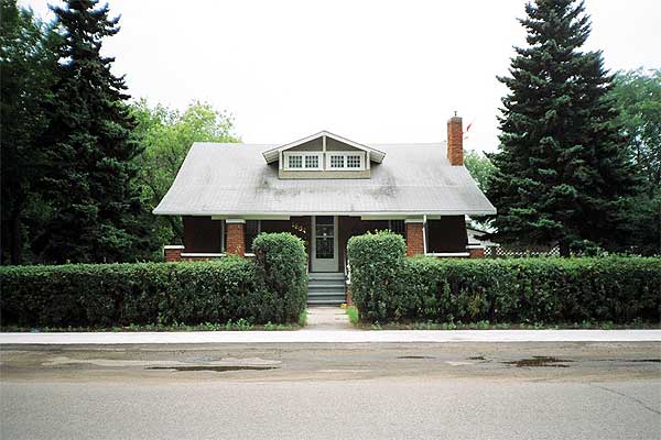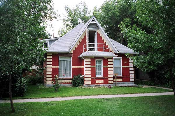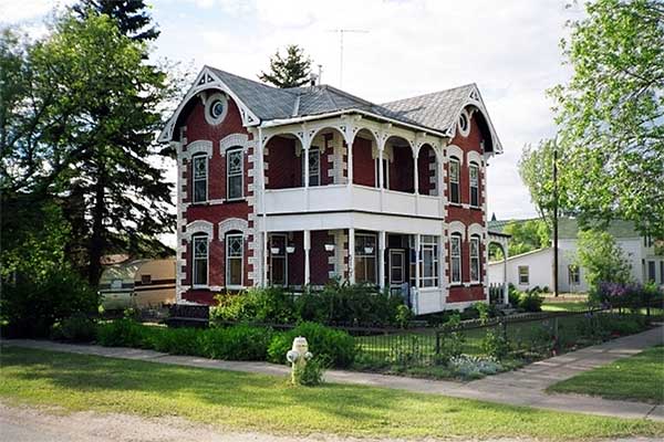 Well-kept and charming, this fine example of a mansard-roofed house was built around 1900. The house is constructed of concrete blocks, formed and scored to look like stone. This was a popular technique around this period when the blocks were made on site using a press. The delicate details on the verandah, striking colours and the setting make it enticing and rustic. Notice the pleasant interplay of the gables over the dormers and the one over the porch entry. Other Manitoba towns with mansard-roofed houses include Oak Lake, Dunrea, Holland, Roland and Mariapolis.