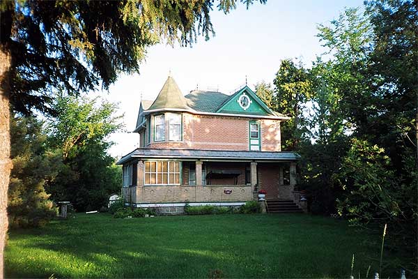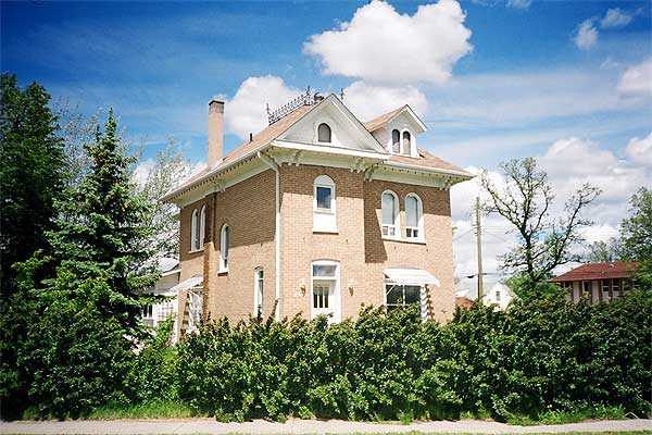 This eloquent two-storey Queen Anne style house demonstrates the early prosperity of Wawanesa. Executed in pale buff brick with sleek vertical massing, it features a variety of openings with small arches on the first floor and full arches on upper windows, gable and dormer. Paired brackets, slim chimney and metal cresting contribute to the effect. The shingle colour complements the pale brick.