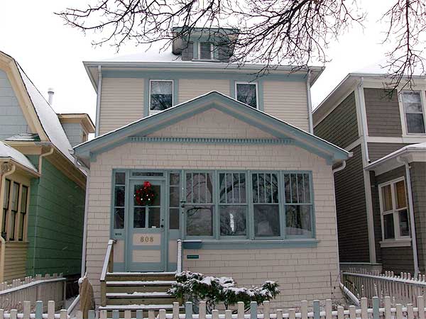 Built in 1914 when its west Fort Rouge neighbourhood was being developed, this standard off-centre entry, side staircase design is one of probably 20,000 similar houses in Winnipeg. Set on a thick fieldstone foundation, the house sports a full porch with substantial gable softened by a fine dentil. Contrasting with the inviting playfulness of the porch, the front elevation uses solid symmetry to move your attention to the dormer and beyond. One of the few remaining wooden picket fences in the area surrounds the front yard. The interior features an oak staircase, oak trim and hardwood floors. This is the house Linda and Reid call home.