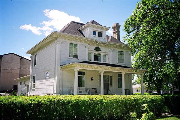 J. D. McLean, a tinsmith and hardware merchant, built this delightful two-storey Queen Anne style house about 1909. The masonry overall is exceptional with creative and contrasting brickwork all around. The major feature of the home is the fine corner turret with its many windows and a steep six-sided roof. Two gables with fish-scale shingling and bull’s eye windows balance the turret. The iron cresting along the roof ridges remains in good condition. Shoal Lake, by the way, is Reid’s hometown.