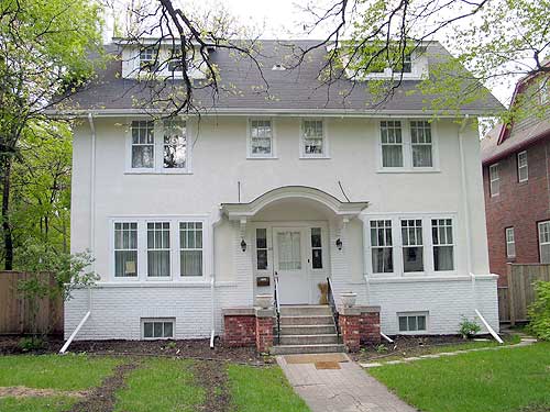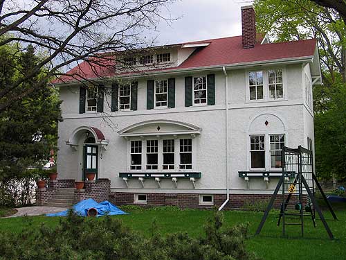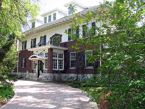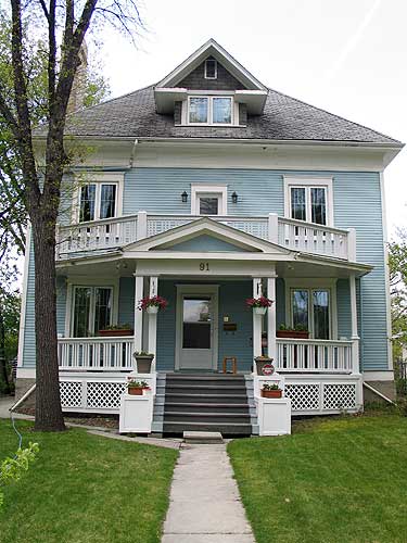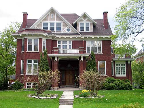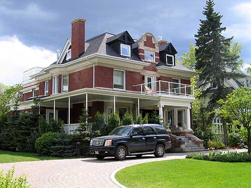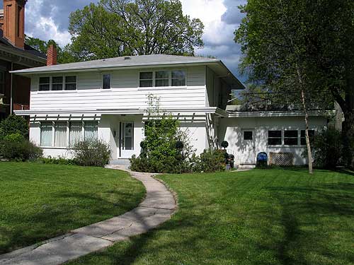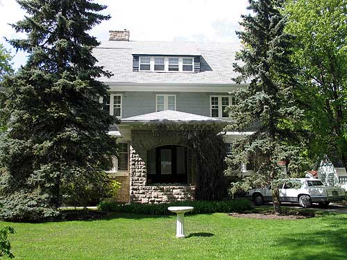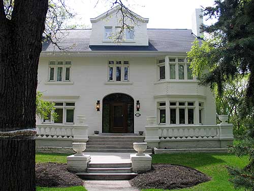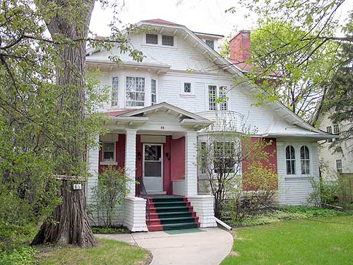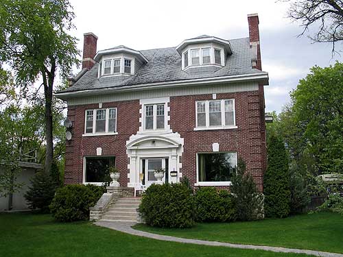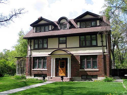 The solid proportions of this home are typical of the English Georgian tradition as are the small-paned windows and hip roof. The house has its own ballroom. It was built in 1911 for the Western Regional Manager of the Bank of Commerce - Vere C. Brown. In the 1920s the owner was H. E. Sellers, President of Federal Grain Company. In 1970, it was renovated for the President of the University of Manitoba. The large window space over the main entrance formerly held a glorious stained-glass window depicting a ship which, unfortunately, was removed and sold by a short-term owner. (1911)
