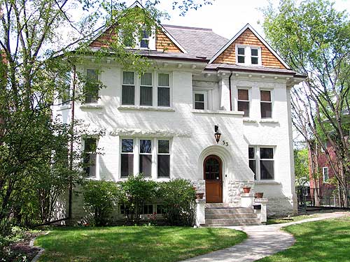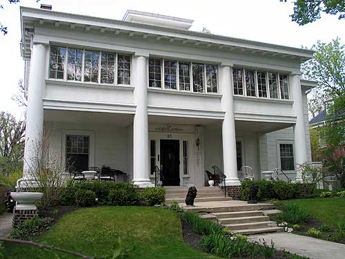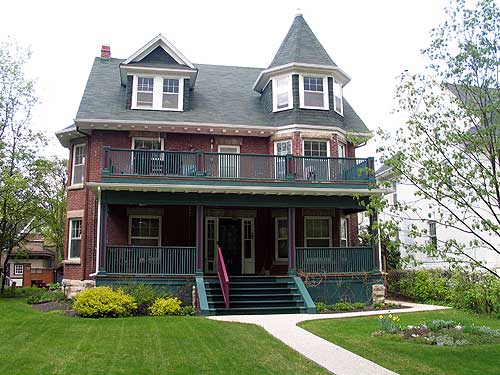 This golden brick dwelling built in 1909 is representative of the large luxurious homes of the area. Note the stone pediment above the front porch, the nicely carved window surrounds, and the leaded windows. The elegant wrought iron railings compliment both the house and garden.