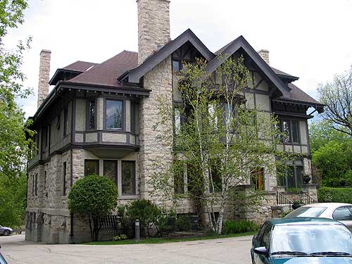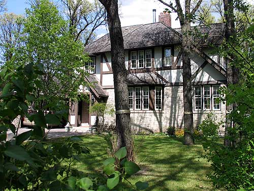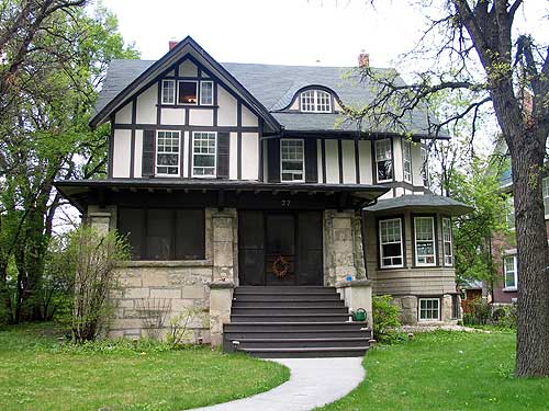 This gracious house with rusticated Tyndall stone below and half-timbering above was the fourth house built in Winnipeg for the Ashdown family. The symmetry is unusual for Tudor style, which is usually deliberately asymmetrical. It was designed by Winnipeg architect J. H. G. Russell, who was a prolific designer of various types of buildings including warehouses, churches and schools as well as private homes. Some of his best known works in the city include the Westminster and Augustine churches and the Childs Building.