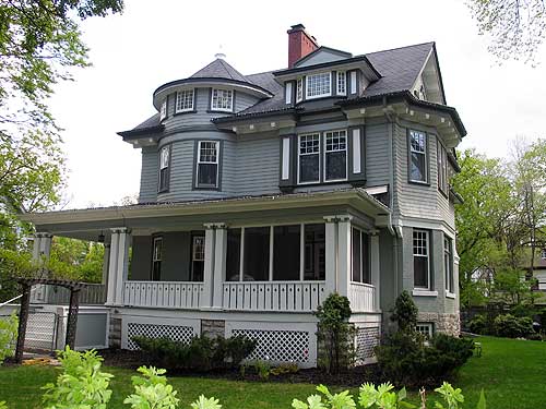 This is an attractive Queen Anne style house with a tower, verandah, gray clapboard and a Palladian window at the side. (1911)