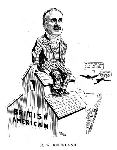Built in 1910-11 by a lawyer, A. C. Ewart, it was occupied a few years later by Ethelbert W. Kneeland who was president of his own grain company and manager of the British Elevator Company. Note the Italianate style with the shallow pitched roof, the symmetrical composition, and the wrought iron trim. (1911)