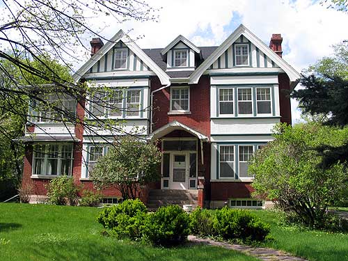 This picturesque house is in the Elizabethan manor style with half-timbering and multi-paned windows. The second storey overhangs the first storey and the gables have decorative barge-board and finials. The chimneys set at an angle to the house add further to its charm. The first owner was Robert R. Scott who earned his fortune in the fruit business and also was president of Sovereign Life Assurance Company. (1914)