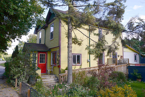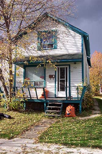 This 1¾-storey home has an enclosed verandah and decorative cedar shingles on gable.